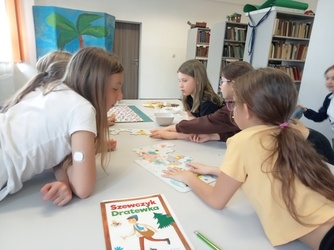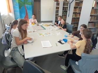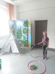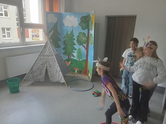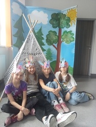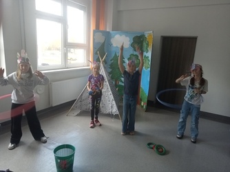 Kolejnym miejscem jakie odwiedziliśmy to indiańska wioska w Ameryce Północnej. Taką też próbowaliśmy stworzyć w naszej bibliotece. Uczniowie mogli poznać pięknego, zielonego wojownika z baśni pod takim samym tytułem. Dodatkowo graliśmy w indiańskie gry rywalizacyjne. Poznaliśmy tradycje indiańskie takie jak np. sens i znaczenie imion nadawanych u Indian. Aby poczuć się jak prawdziwi rdzenni mieszkańcy Ameryki każdy uczestnik wykonał pióropusz oraz grupa nadała mu pasujące do niego imię.