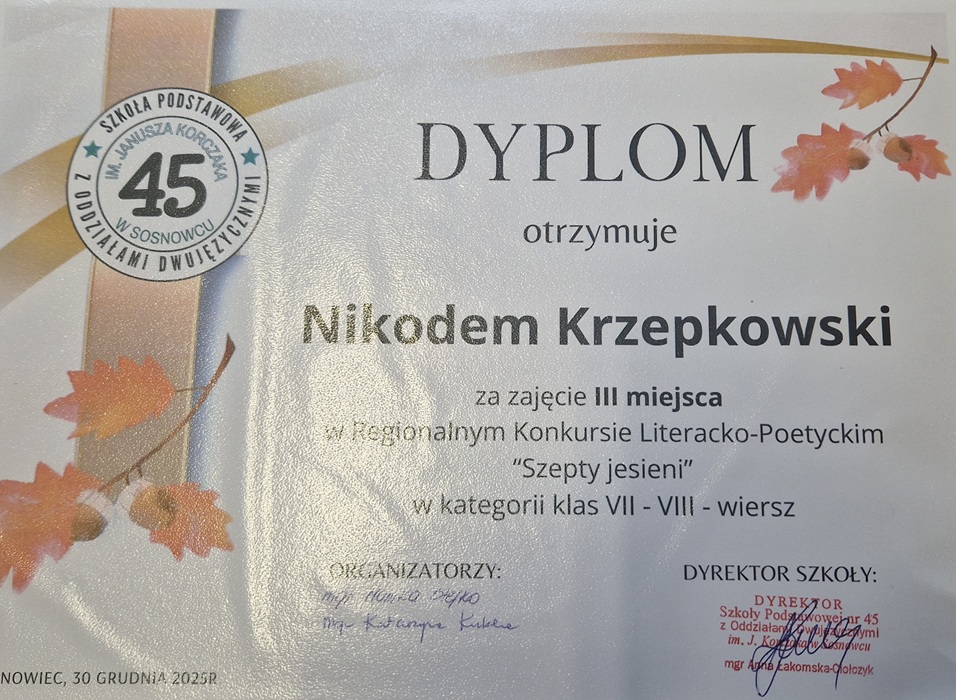 Z radością informujemy, że uczeń naszej szkoły Nikodem Krzepkowski VIII SK zajął III miejsce w Regionalnym Konkursie Literacko-Poetyckim "Szepty jesieni". Gratulujemy i życzymy dalszych sukcesów.